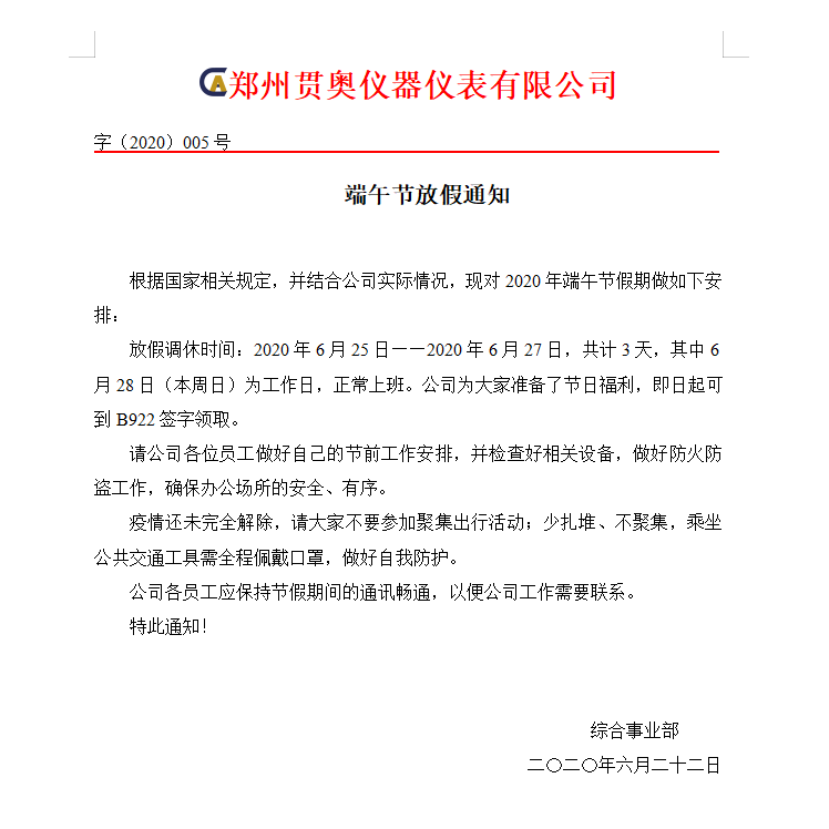 2020端午佳節(jié)將至,首先向鄭州貫奧儀器儀表有限公司全體員工及家人致以節(jié)日誠(chéng)摯的問(wèn)候。