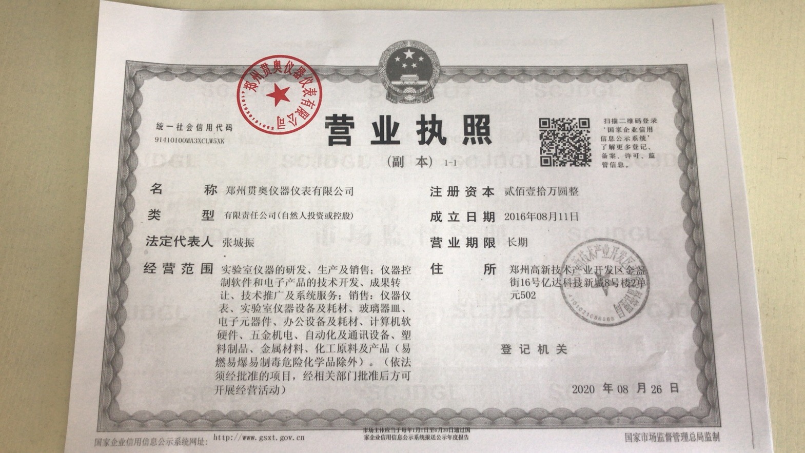 鄭州貫奧儀器儀表有限公司營業(yè)執(zhí)照