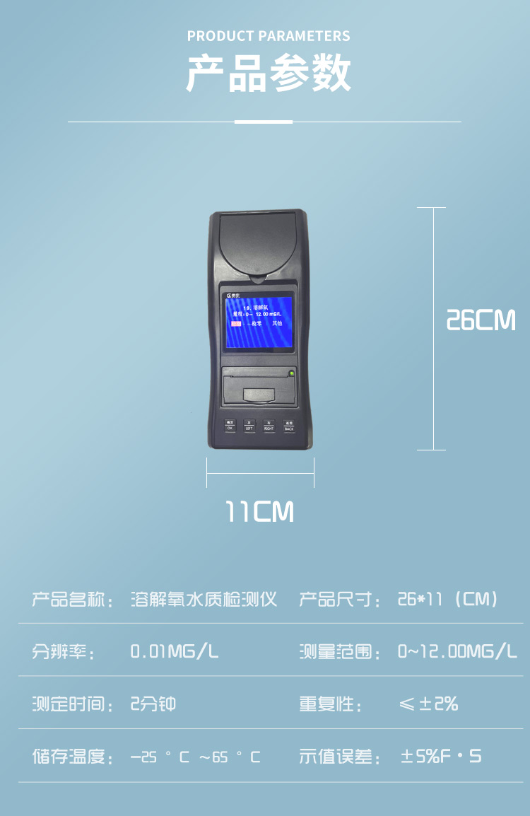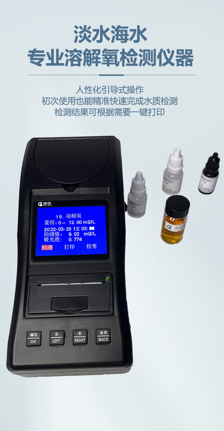 3、溶解氧測試儀采用分光光度的光電比色原理,操作簡便,取水樣放入試劑反應幾分鐘即可讀數,重復性≤±2%。