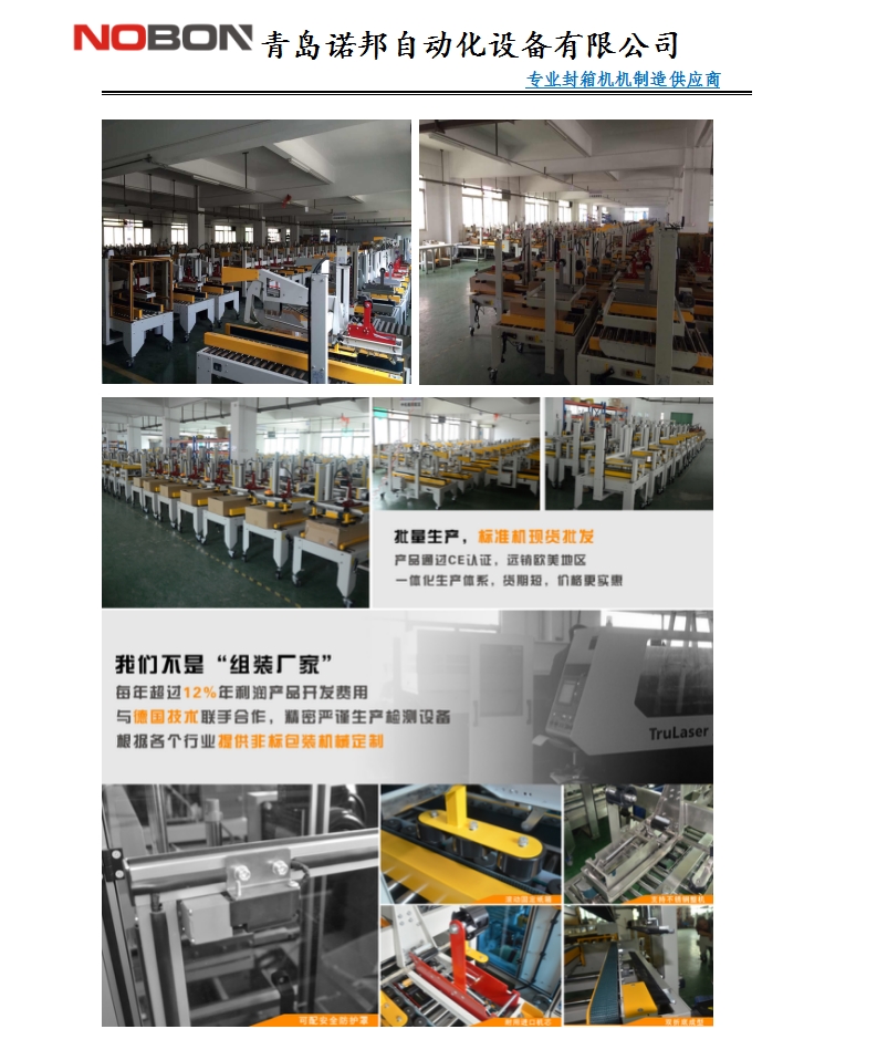 全自動封箱機NF-5050E可以自動調節紙箱高度及寬度,更換不同規格紙箱無需人工調節;推薦更換紙箱規格頻繁的用戶使用。采用即貼膠帶封口,上下封箱,快速,平穩,且封箱效果平整、規范、美觀 可根據紙箱規格,手工調節寬度與高度,簡單,快捷,方便 可替代人工,提高30%的生產效率,節省5-10%耗材,為企業節省成本,提高生產效率,實現包裝標準化的選擇。推薦配合輸送線使用自動折蓋封箱機實現無人化自動包裝線。節省人工。